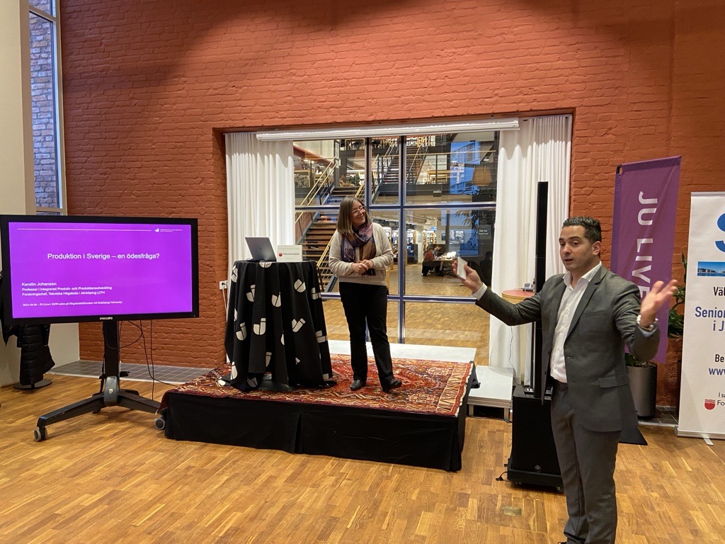 Kerstin Johansen, forskningschef på Tekniska Högskolan (JTH) vid Jönköping Univeristy (JU), föreläste om produktion under JU LIVE på Högskolebiblioteket vid Jönköping University den 26 oktober.